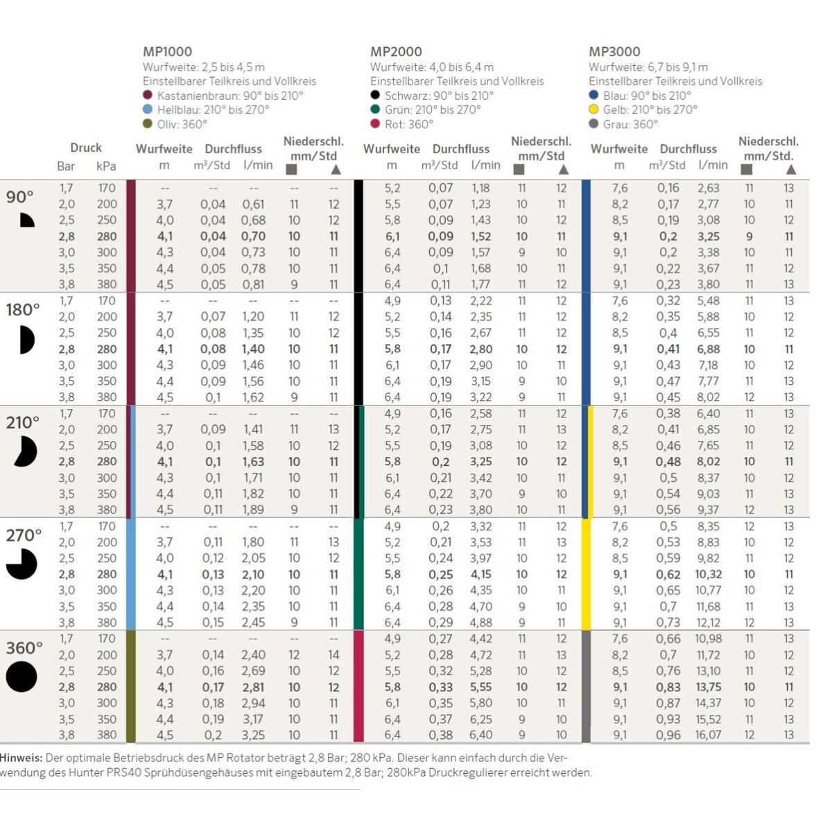 - MP1000-210 = 2,5 bis 4,5 m Wurfweite, einstellbar von 210º bis 270º