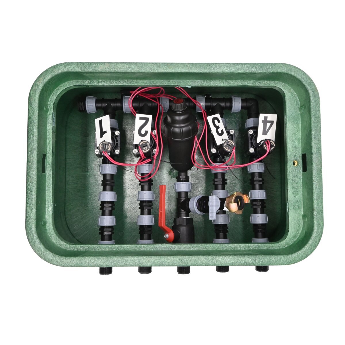 Vormontierte Ventilbox, mit Hunter Ventilen für 4 Zonen.