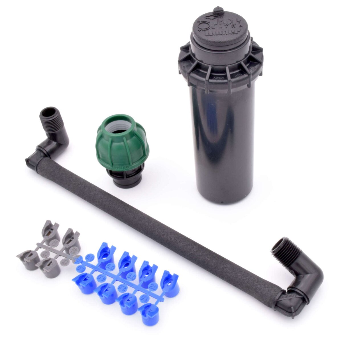 Praktisches Set bestehend aus Regner, Gelenkanschluss, Düsenset und Verbinder.
