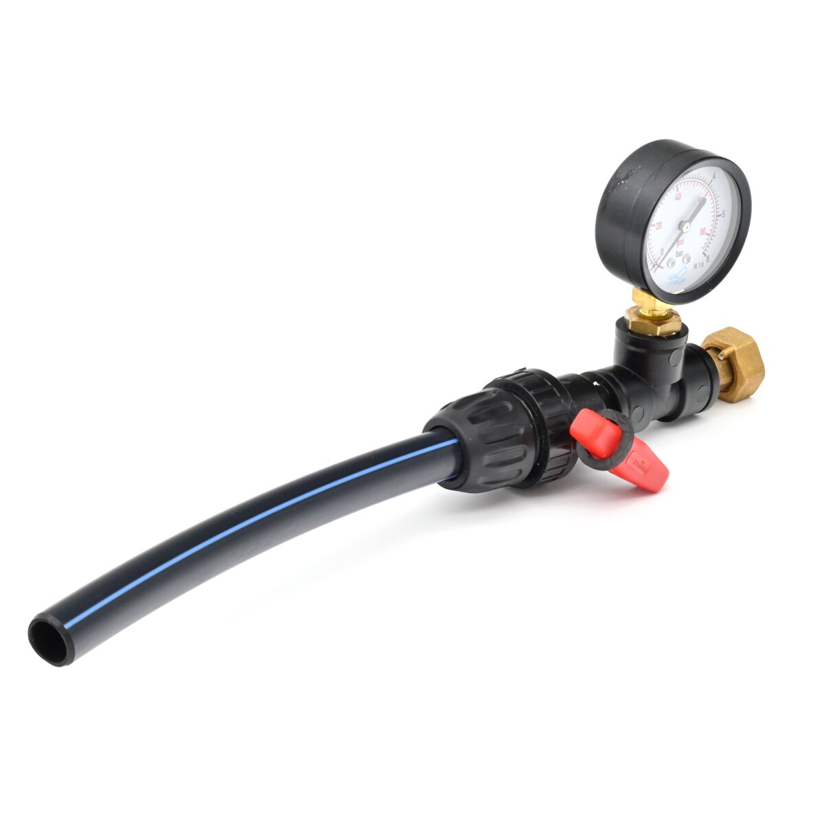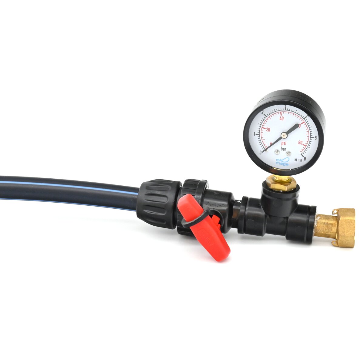 Sie können mit Hilfe des Messgeräts und eines 10L Eimers die Wassermenge bestimmen. Die Wassermenge ist die Grundlage für die Ermittlung der maximalen Anzahl der Regner oder maximalen Tropfer des Tropfrohrs pro Bewässerungskreis. Der Betriebsdruck der Anlage sollte 3,5 Bar nicht unterschreiten.