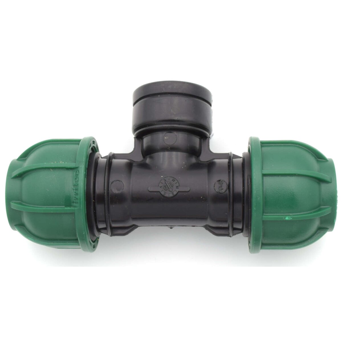 90° T-Stück mit Innengewinde am Mittelstutzen.